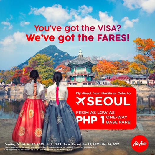 AirAsia has launched a new promo offering a P1 one-way base fare to Seoul, South Korea. The promo is available for flights from Manila or Cebu to Seoul Incheon International Airport, and the booking period is from June 26 to July 2, 2023. The travel period is from June 26, 2023 to December 14, 2023.