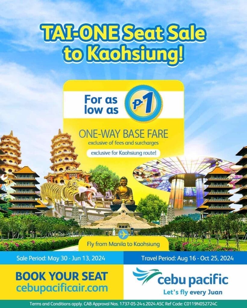 Get ready for an incredible adventure! CEB’s signature Piso Sale is back, offering one-way base fares to Kaohsiung for as low as P1 (excluding fees and surcharges). This limited-time promo runs from May 30 to June 13, 2024, with travel dates valid from August 16 to October 25, 2024. Don’t miss this chance to explore a new destination at an unbeatable price!